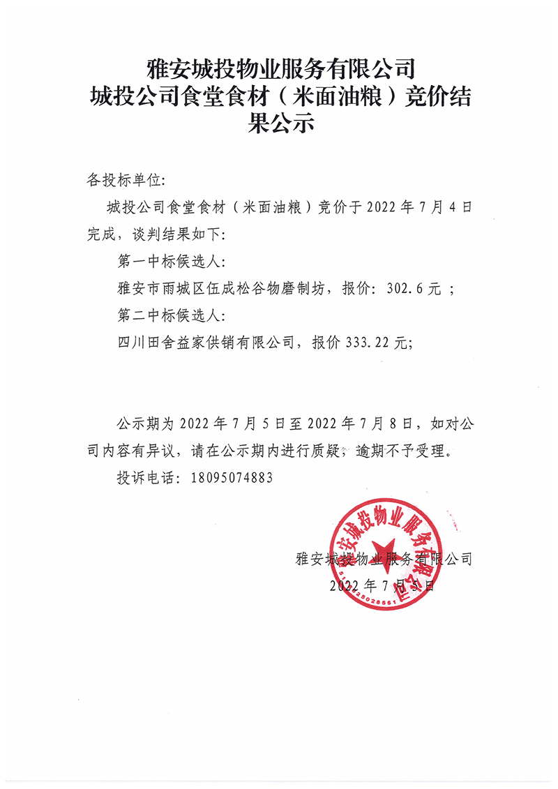 城投公司食堂食材(米面油糧)競(jìng)價(jià)結(jié)果公示