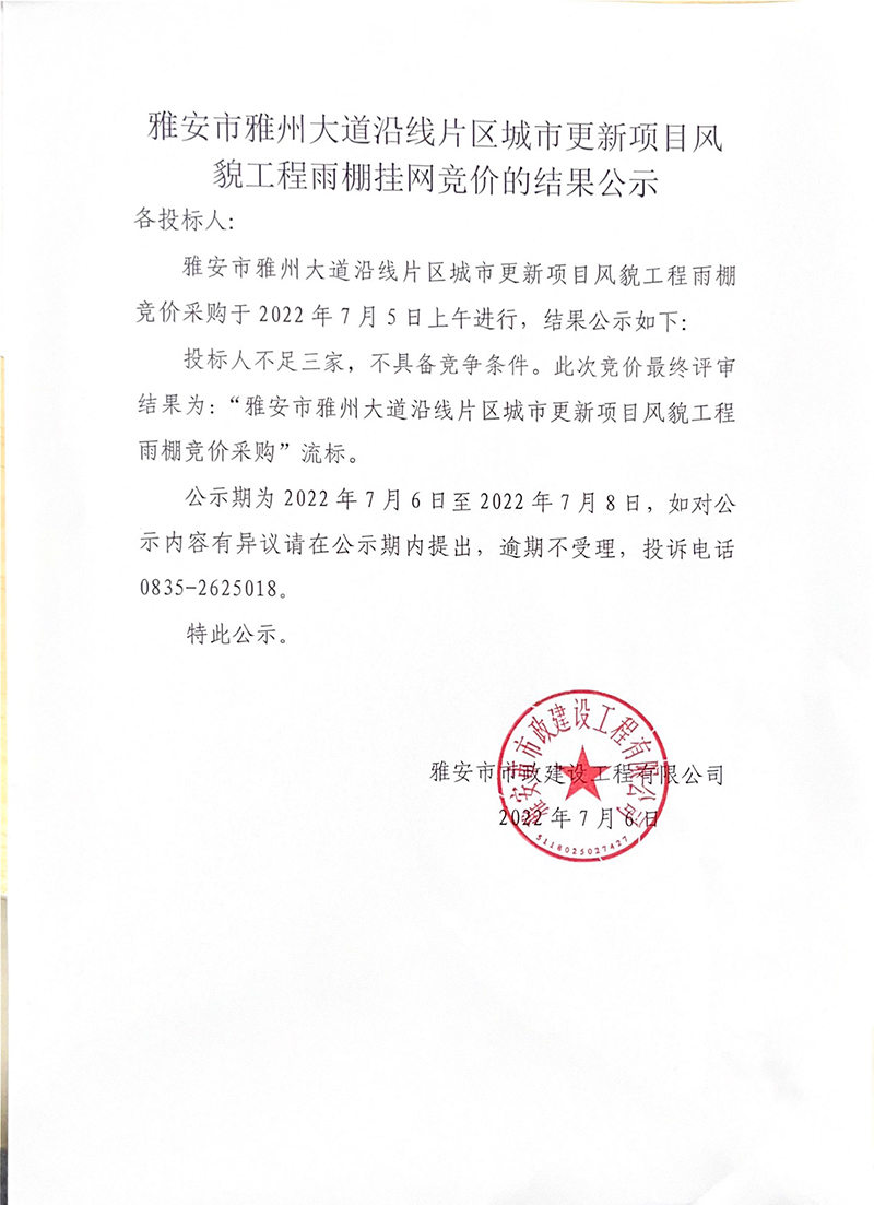雅安市雅州大道沿線片區(qū)城市更新項(xiàng)目風(fēng)貌工程雨棚競(jìng)價(jià)結(jié)果公示