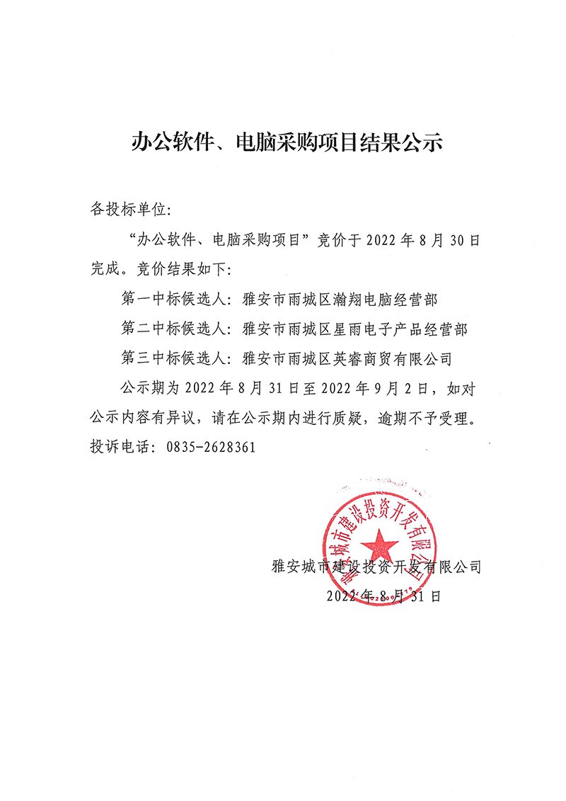 雅安城市建設(shè)投資開發(fā)有限公司辦公軟件、電腦采購項(xiàng)目結(jié)果公示