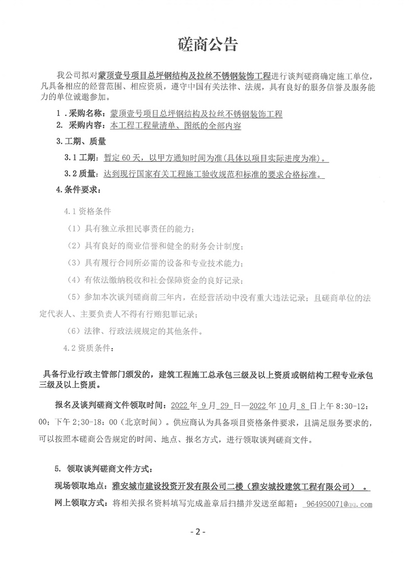 蒙頂壹號項目總坪鋼結(jié)構(gòu)及拉絲不銹鋼裝飾工程談判磋商公告