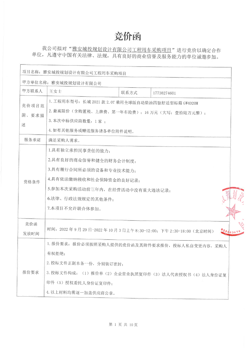 雅安城投規(guī)劃設(shè)計有限公司工程用車采購項目競價公告
