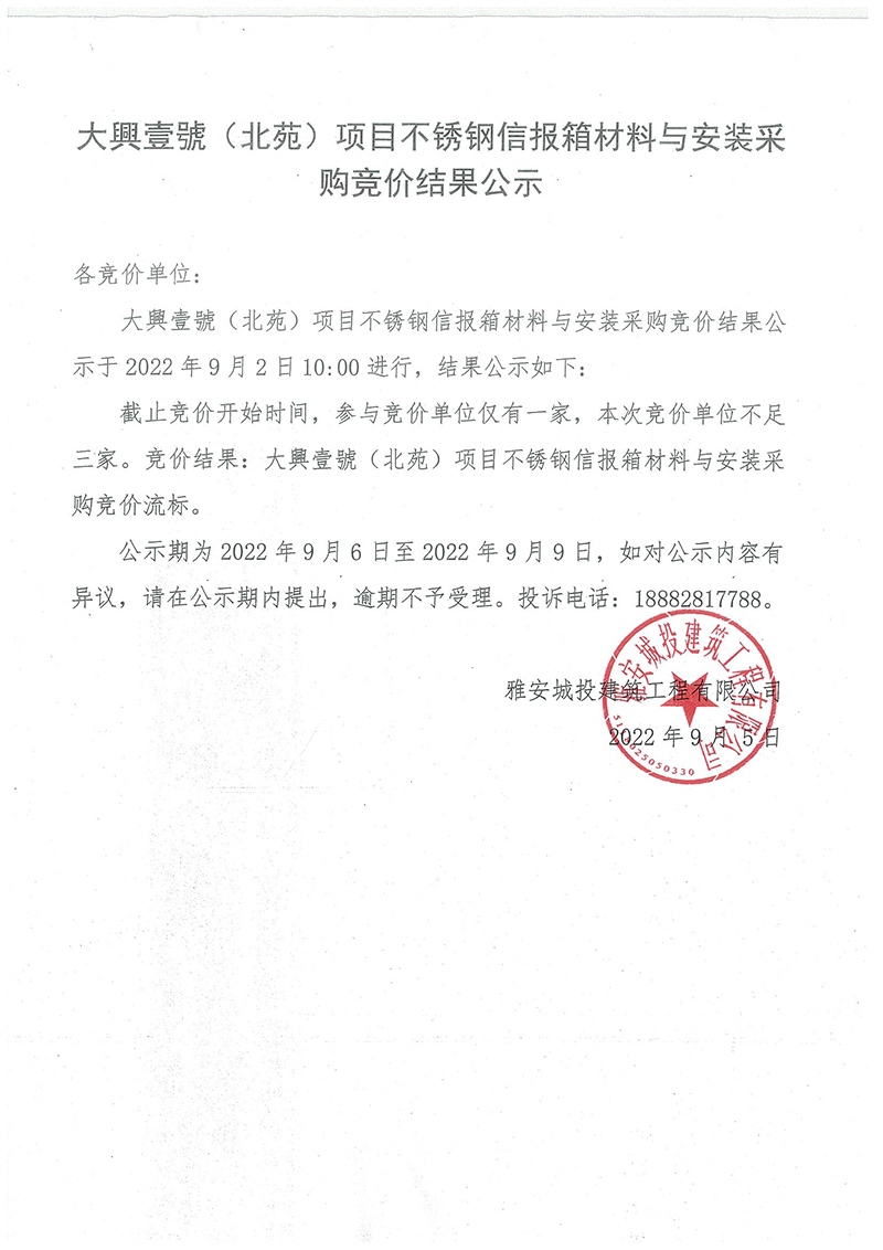 大興壹號(北苑)項目不銹鋼信報箱材料與安裝采購競價結果公示