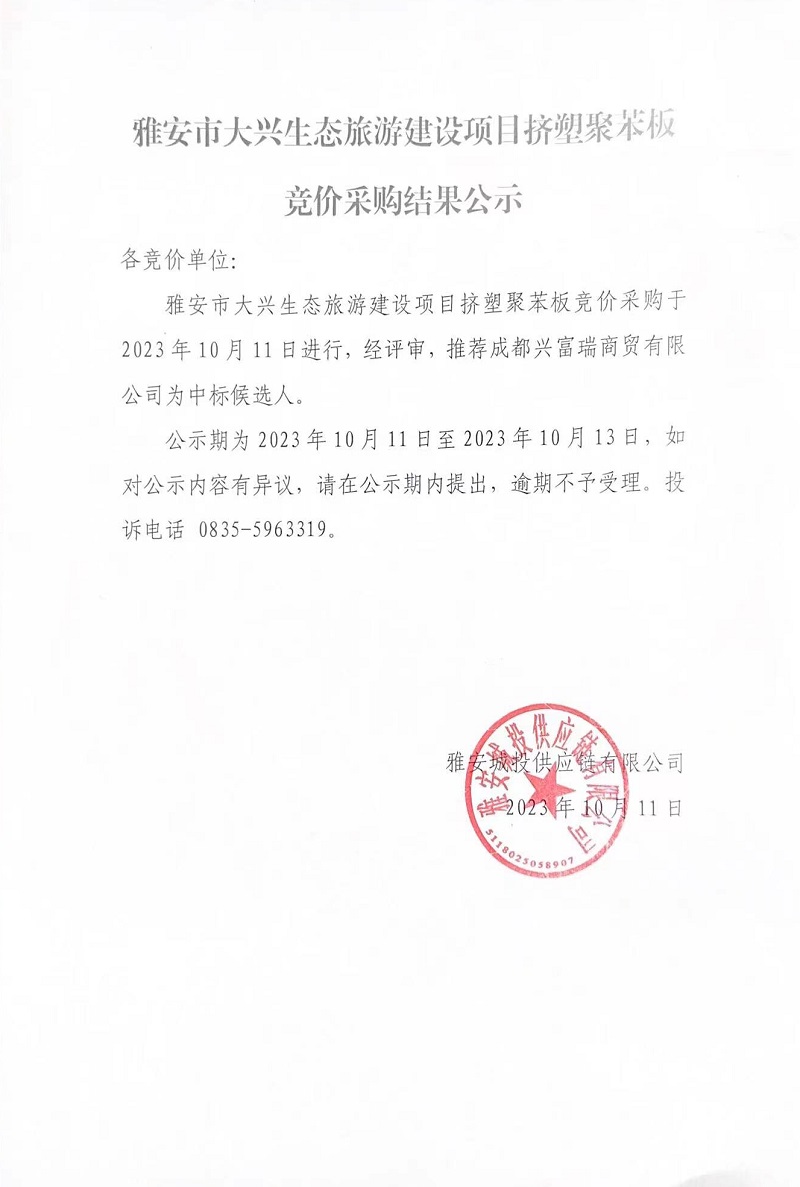 雅安市大興生態(tài)旅游建設(shè)項(xiàng)目擠塑聚苯板競價(jià)采購結(jié)果公示