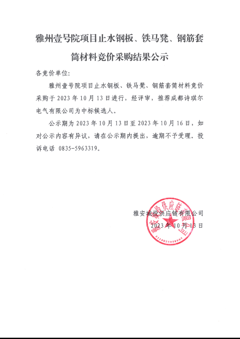 雅州壹號(hào)院項(xiàng)目止水鋼板、鐵馬凳、鋼筋套筒材料競(jìng)價(jià)采購結(jié)果公示