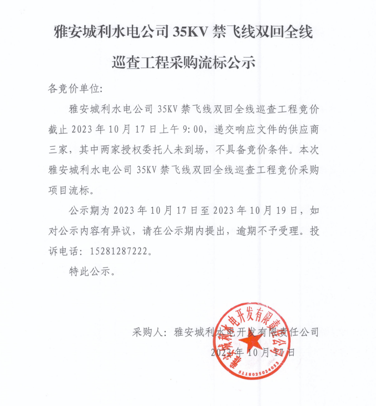 雅安城利水電公司35KV禁飛線雙回全線巡查工程采購流標(biāo)公示