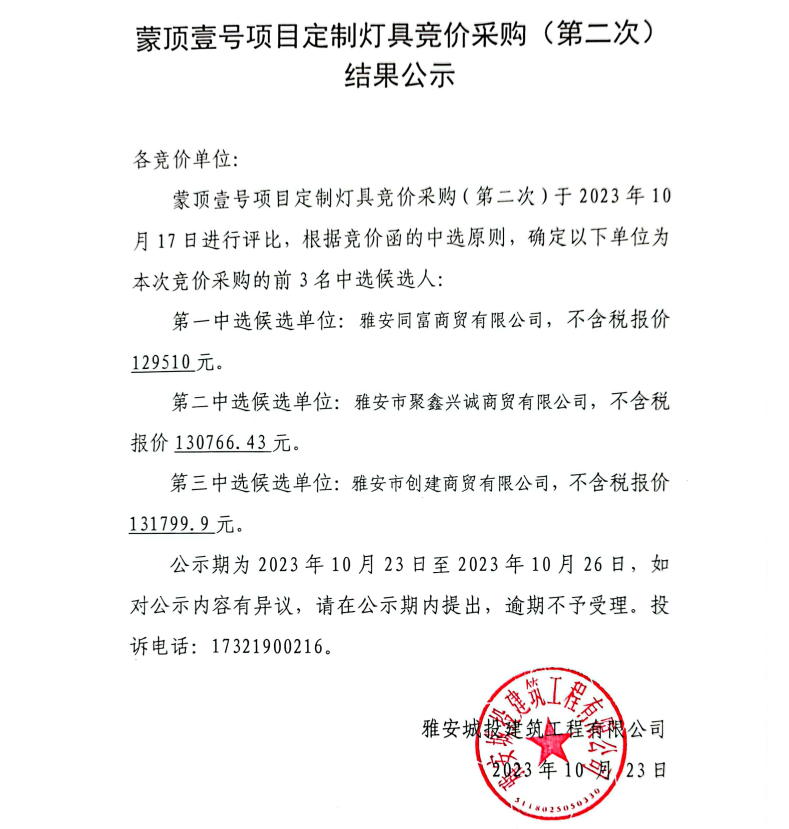 蒙頂壹號(hào)項(xiàng)目定制燈具競價(jià)采購(第二次)結(jié)果公示