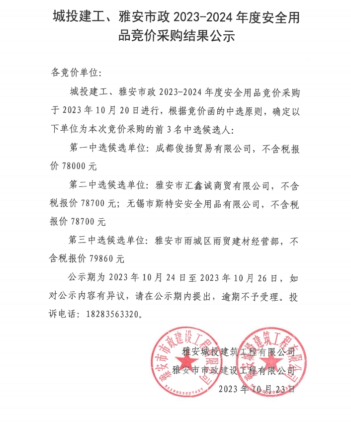 城投建工、雅安市政2023-2024年度安全用品采購結果公示