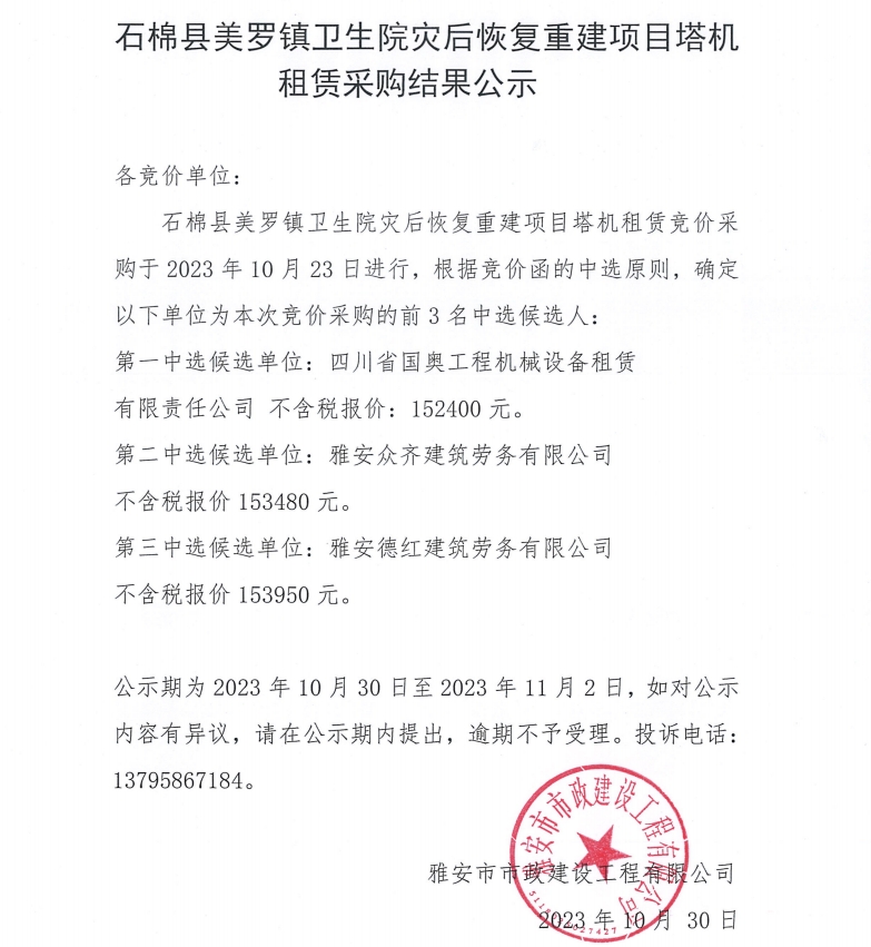 石棉縣美羅鎮(zhèn)衛(wèi)生院災(zāi)后恢復(fù)重建項目塔機(jī)租賃采購結(jié)果公示