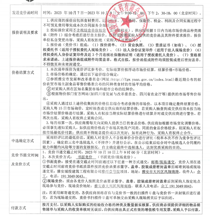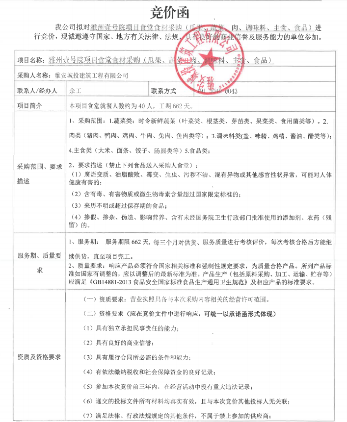 雅州壹號院項目食堂食材采購(瓜果、蔬菜、肉、調味料、主食、食品)競價公告
