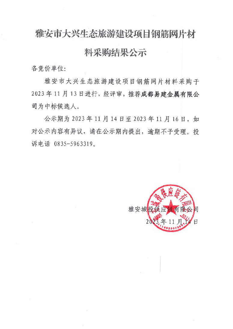 雅安市大興生態(tài)旅游建設(shè)項目鋼筋網(wǎng)片材料采購結(jié)果公示