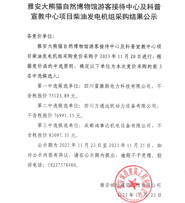 雅安大熊貓自然博物館游客接待中心及科普宣教中心項(xiàng)目柴油發(fā)電機(jī)組采購(gòu)結(jié)果公示