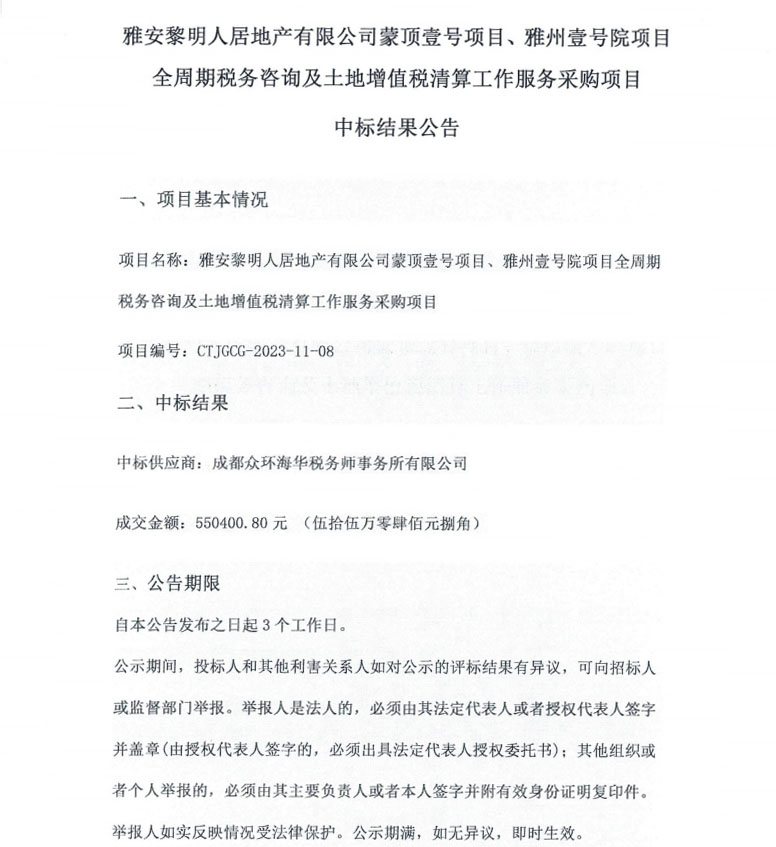 雅安黎明人居地產(chǎn)有限公司蒙頂壹號項(xiàng)目、雅州壹號院項(xiàng)目全周期稅務(wù)咨詢及土地增值稅清算工作服務(wù)采購項(xiàng)目中標(biāo)結(jié)果公告