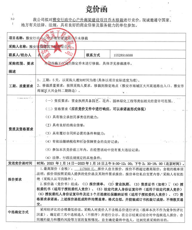 雅安行政中心戶外廊架建設項目喬木移栽競價公告