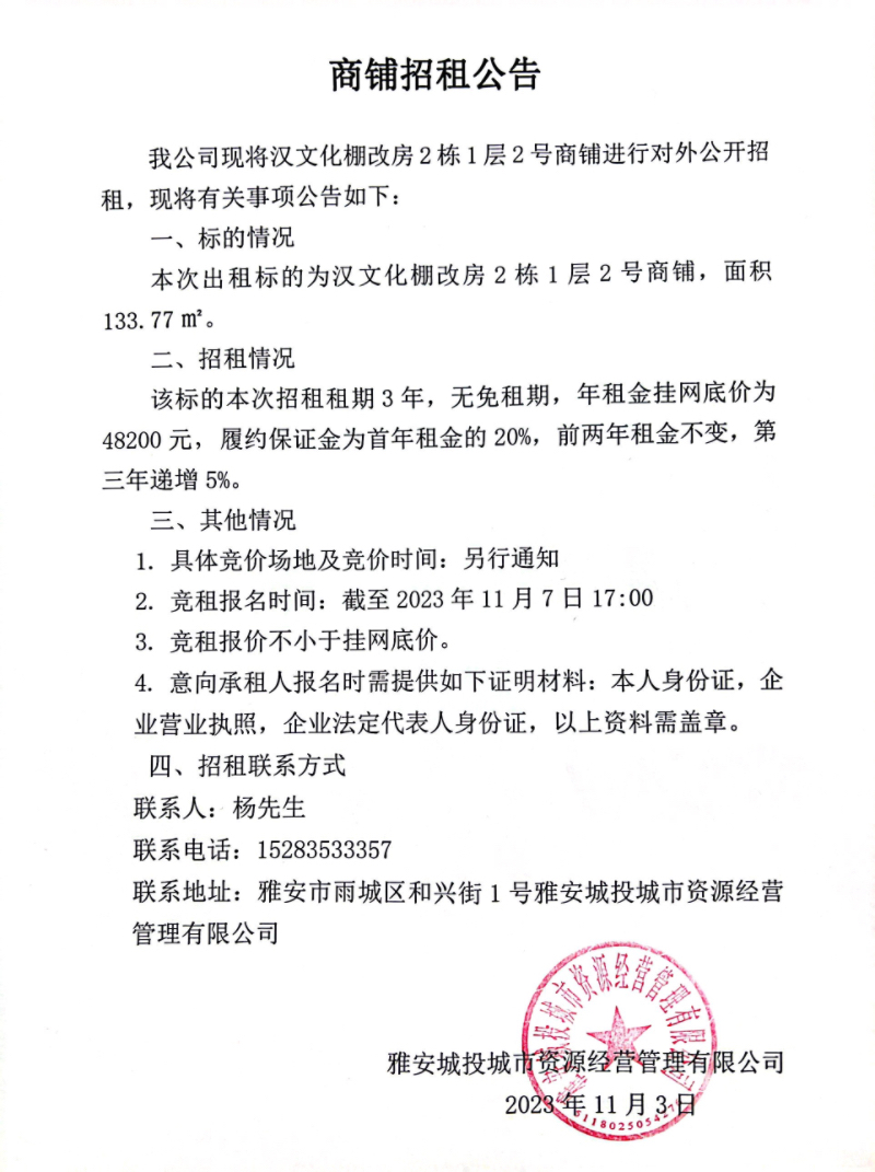 漢文化棚改房2棟1層2號(hào)商鋪招租公告