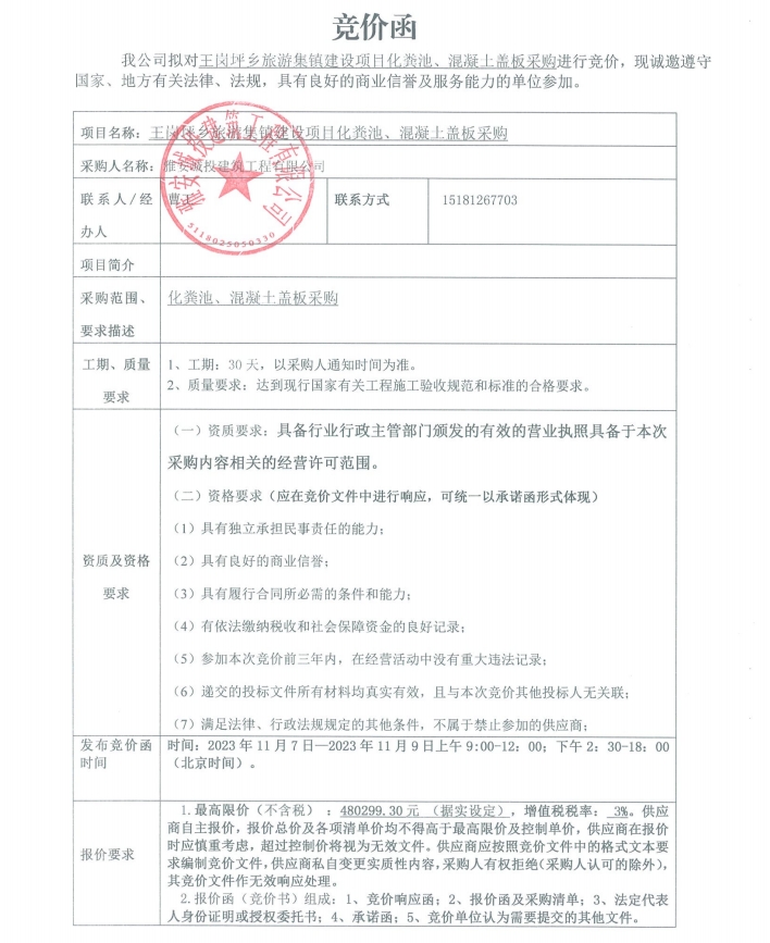 王崗坪鄉(xiāng)旅游集鎮(zhèn)建設(shè)項(xiàng)目化糞池、混凝土蓋板采購競(jìng)價(jià)公告