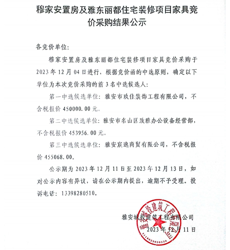 穆家安置房及雅東麗都住宅裝修項(xiàng)目家具采購競價(jià)采購結(jié)果公示