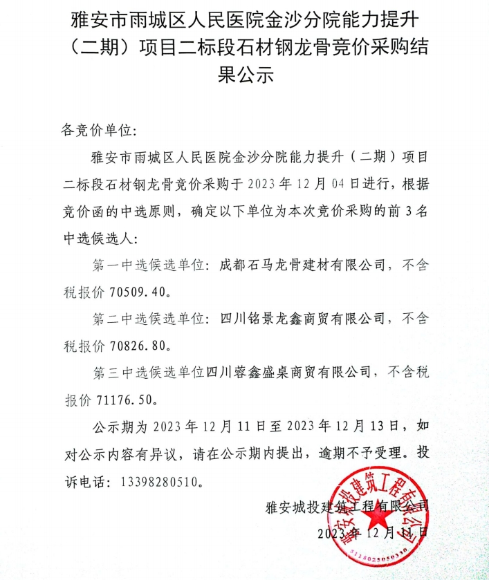 雅安市雨城區(qū)人民醫(yī)院金沙分院能力提升(二期)項目二標(biāo)段石材鋼龍骨采購競價采購結(jié)果公示