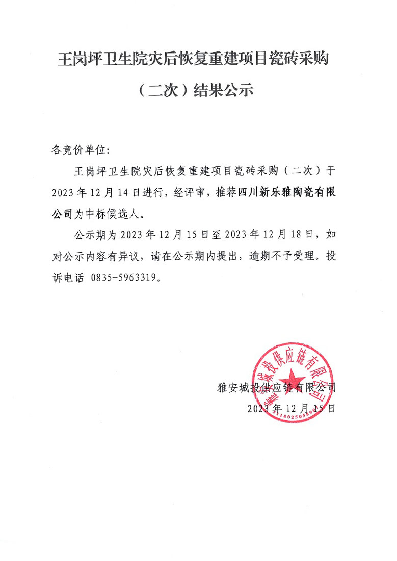 王崗坪衛(wèi)生院災(zāi)后恢復(fù)重建項目瓷磚采購(二次)結(jié)果公示