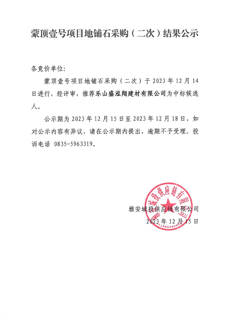 蒙頂壹號項目地鋪石采購(二次)結果公示