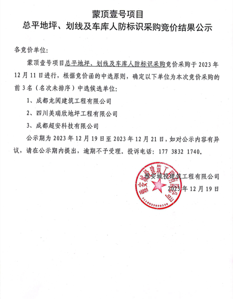 蒙頂壹號項目總平地坪、劃線及車庫人防標(biāo)識采購競價結(jié)果公示