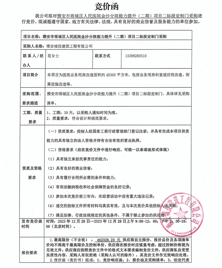 雅安市雨城區(qū)人民醫(yī)院金沙分院能力提升(二期)項目二標段定制門采購競價公告