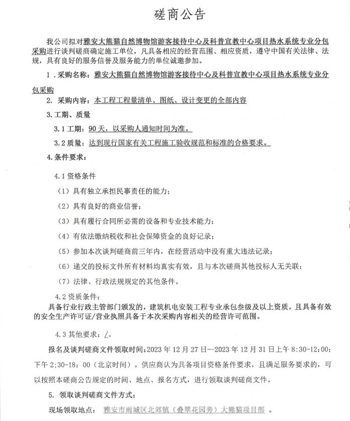 雅安大熊貓自然博物館游客接待中心及科普宣教中心項(xiàng)目熱水系統(tǒng)專業(yè)分包采購(gòu)談判磋商公告