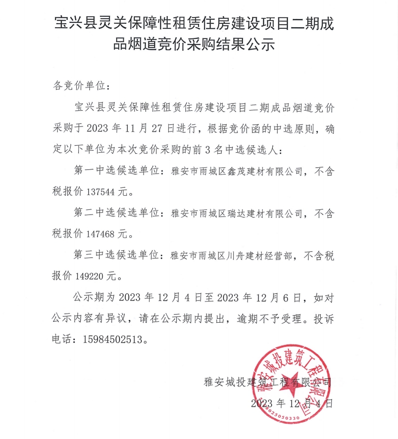 寶興縣靈關(guān)保障性租賃住房建設(shè)項(xiàng)目二期成品煙道競(jìng)價(jià)采購(gòu)結(jié)果公示