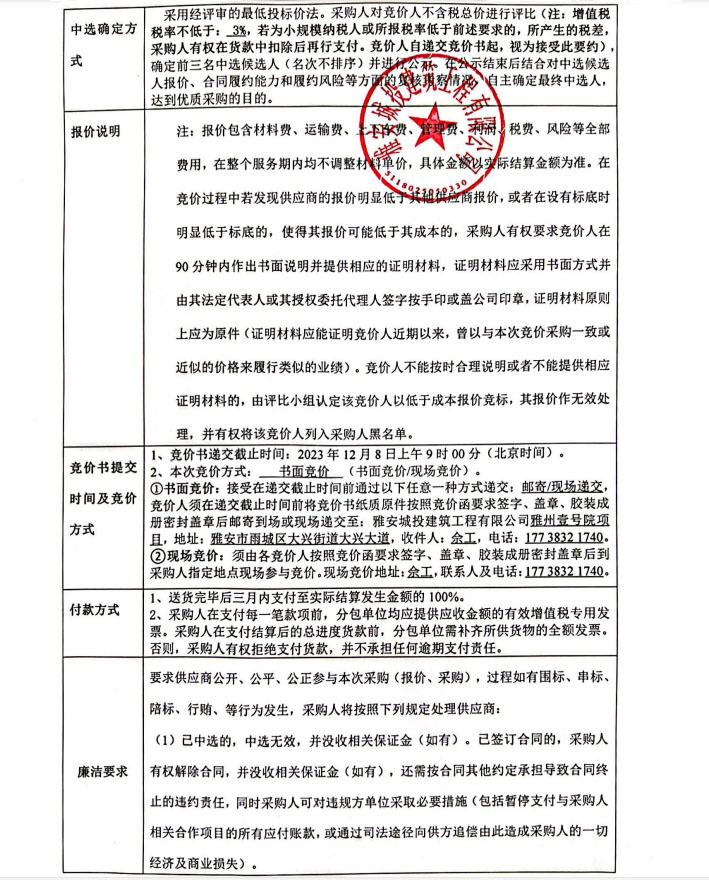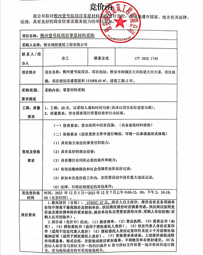 雅州壹號院項目零星材料采購競價公告