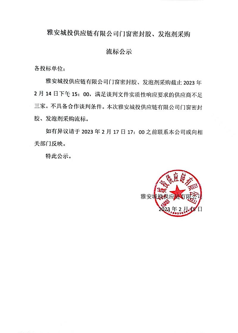 雅安城投供應(yīng)鏈有限公司門窗密封膠、發(fā)泡劑采購流標(biāo)公示