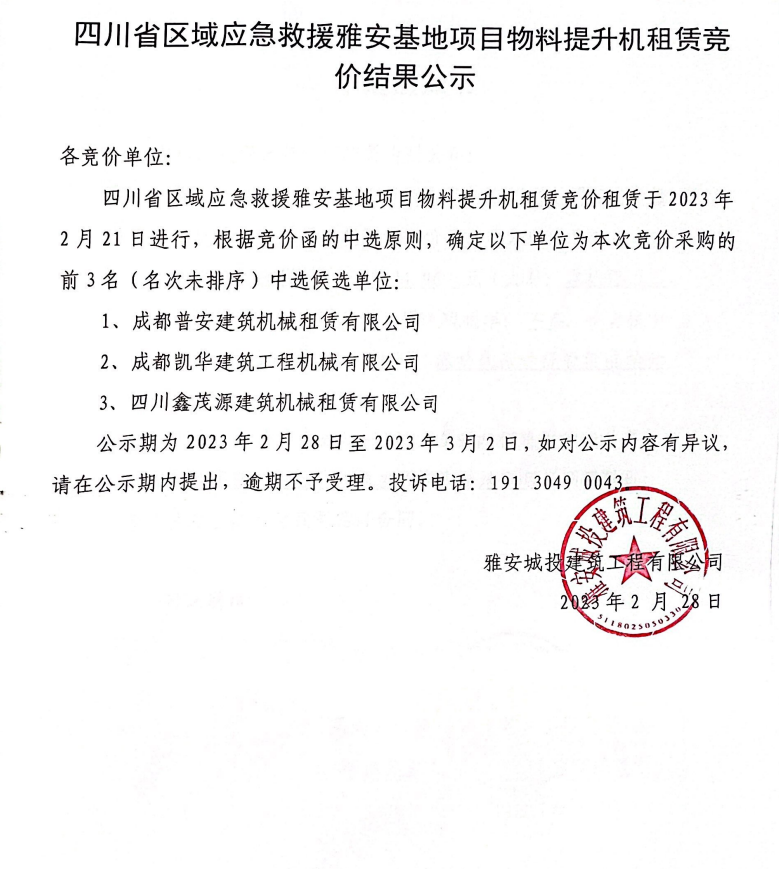 四川省區(qū)域應(yīng)急救援雅安基地項(xiàng)目物料提升機(jī)租賃競價(jià)結(jié)果公示