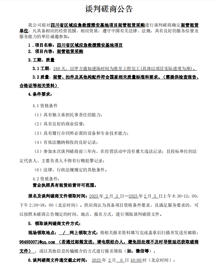 四川省區(qū)域應(yīng)急救援雅安基地項(xiàng)目架管租賃采購(gòu)談判磋商公告