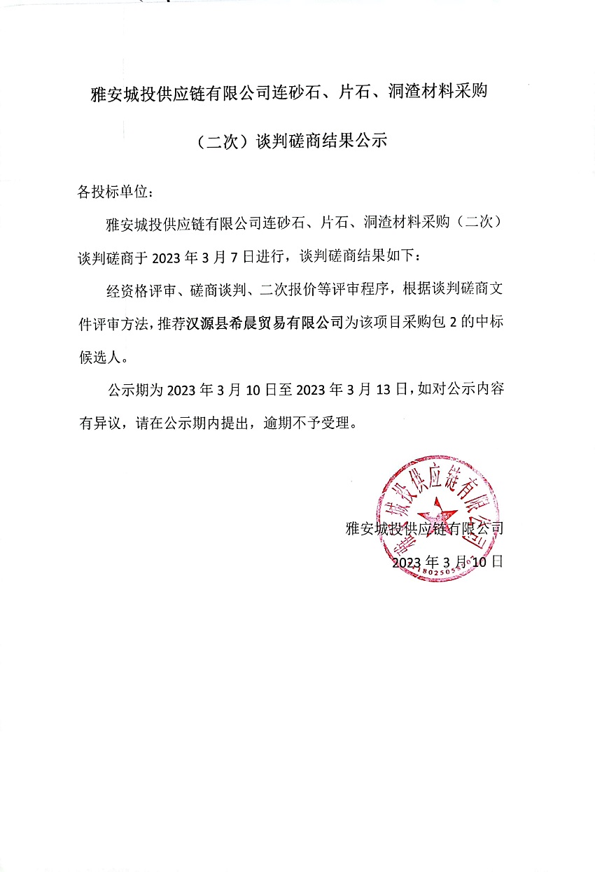 雅安城投供應鏈有限公司連砂石、片石、洞渣材料采購(二次)談判磋商結果公示