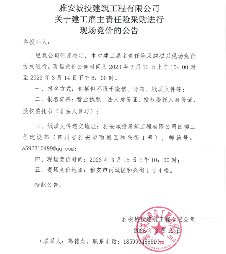 雅安城投建筑工程有限公司關(guān)于建工雇主責(zé)任險采購進(jìn)行現(xiàn)場競價的公告