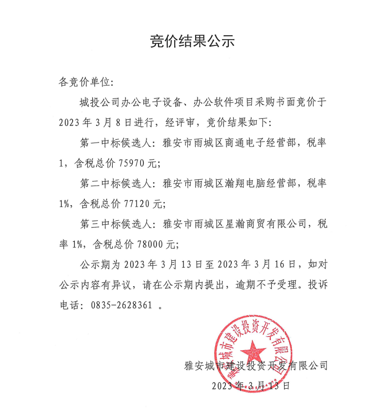 城投公司辦公電子設(shè)備、辦公軟件項目采購競價結(jié)果公示