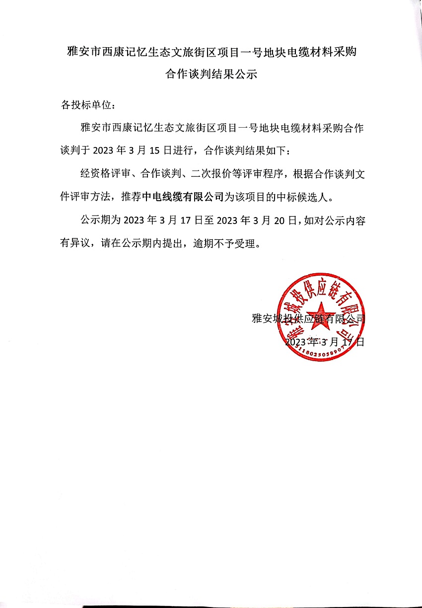 雅安市西康記憶生態(tài)文旅街區(qū)項目一號地塊電纜材料采購合作談判結(jié)果公示