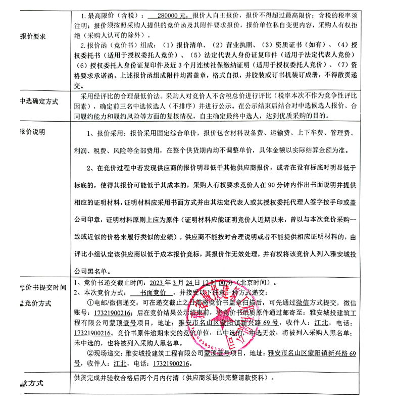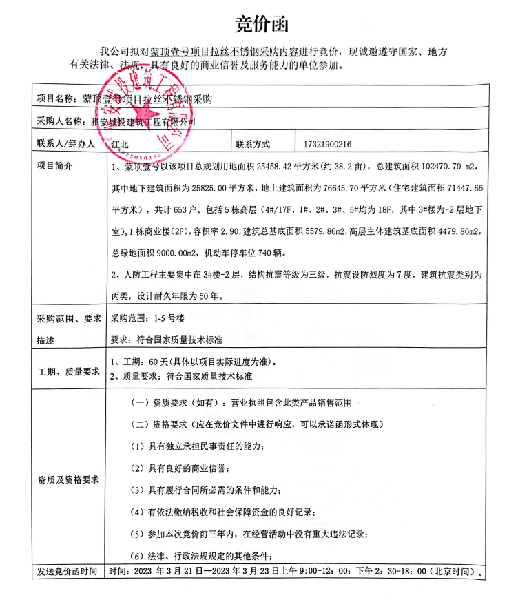 蒙頂壹號項(xiàng)目拉絲不銹鋼采購競價公告