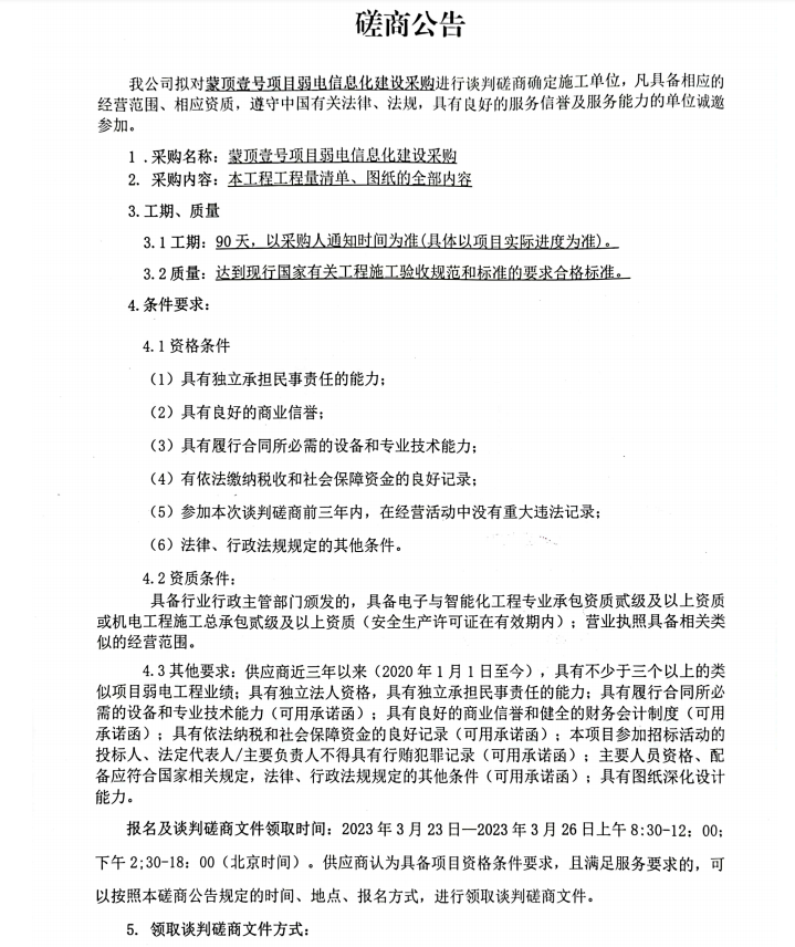 蒙頂壹號項(xiàng)目弱電信息化建設(shè)采購談判磋商公告