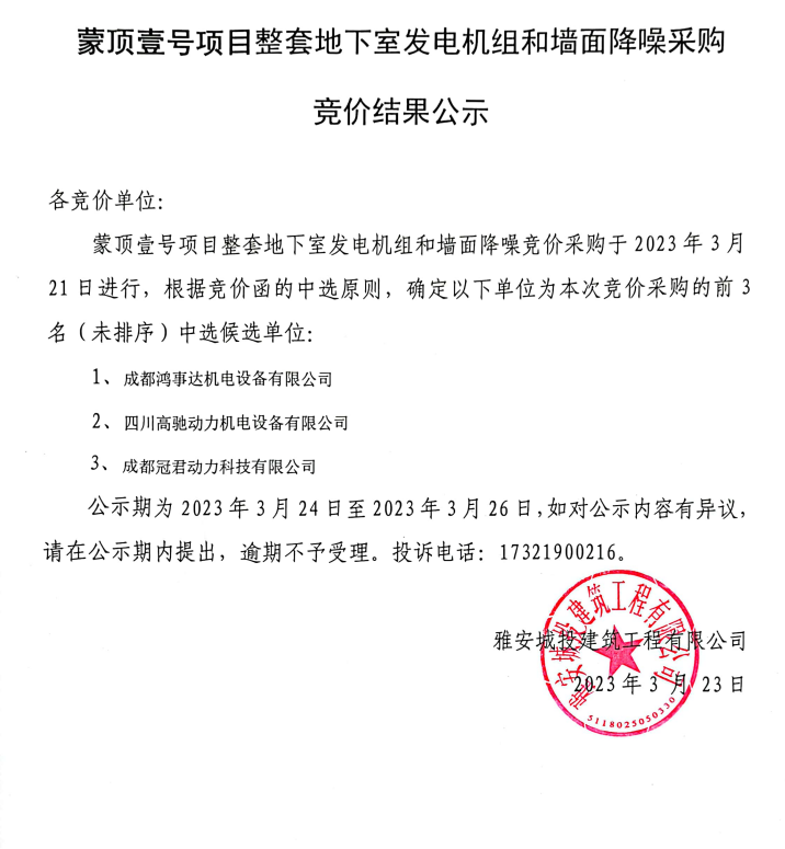 蒙頂壹號項目整套地下室發(fā)電機組和墻面降噪采購競價結(jié)果公示