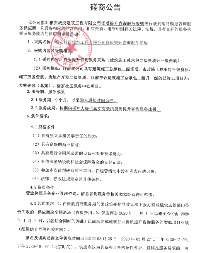 雅安城投建筑工程有限公司資質(zhì)提升咨詢服務(wù)采購(gòu)磋商公告
