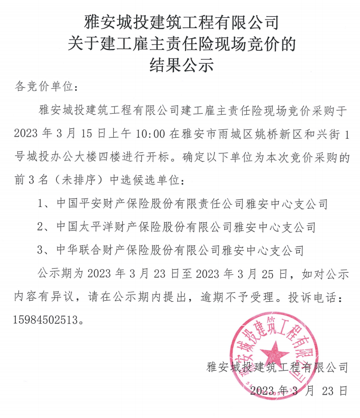 雅安城投建筑工程有限公司關于建工雇主責任險現(xiàn)場競價的結果公示