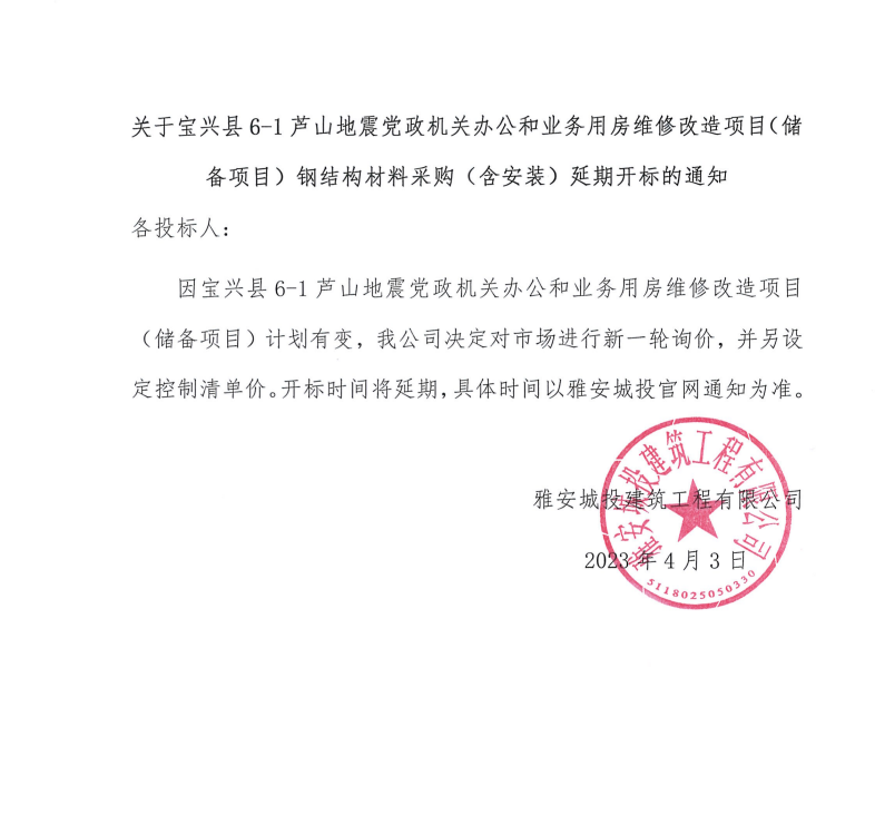 關(guān)于寶興縣6-1蘆山地震黨政機(jī)關(guān)辦公和業(yè)務(wù)用房維修改造項(xiàng)目(儲(chǔ)備項(xiàng)目)鋼結(jié)構(gòu)材料采購(gòu)(含安裝)延期開(kāi)標(biāo)的通知