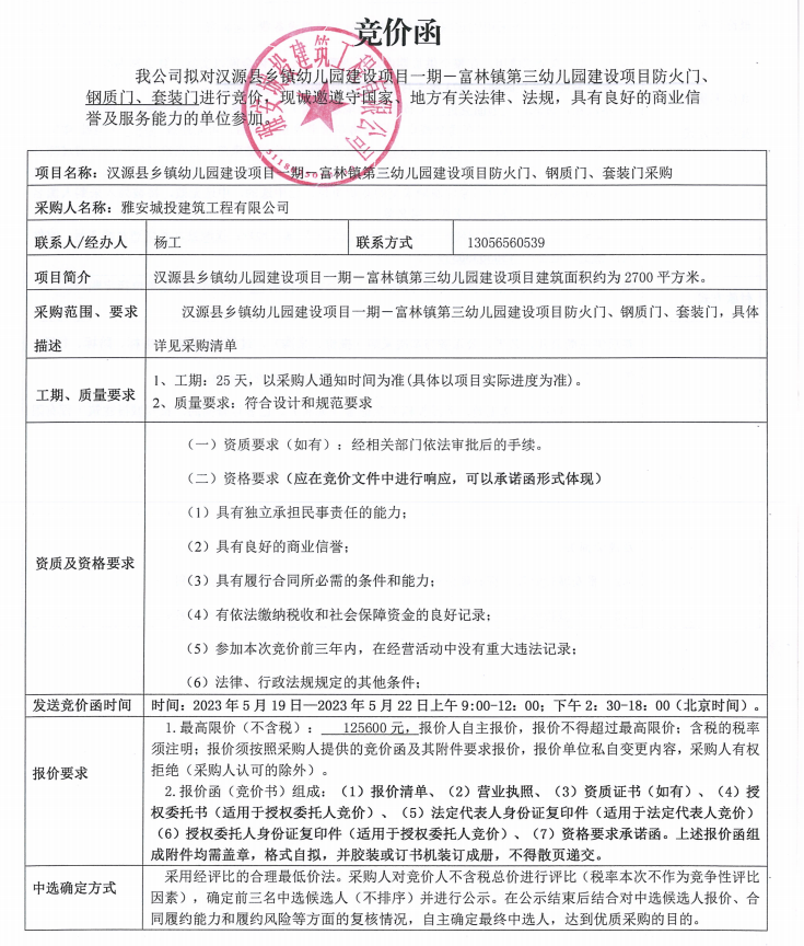 漢源縣鄉(xiāng)鎮(zhèn)幼兒園建設項目一期一富林鎮(zhèn)第三幼兒園建設項目防火門、鋼質門、套裝門采購競價公告