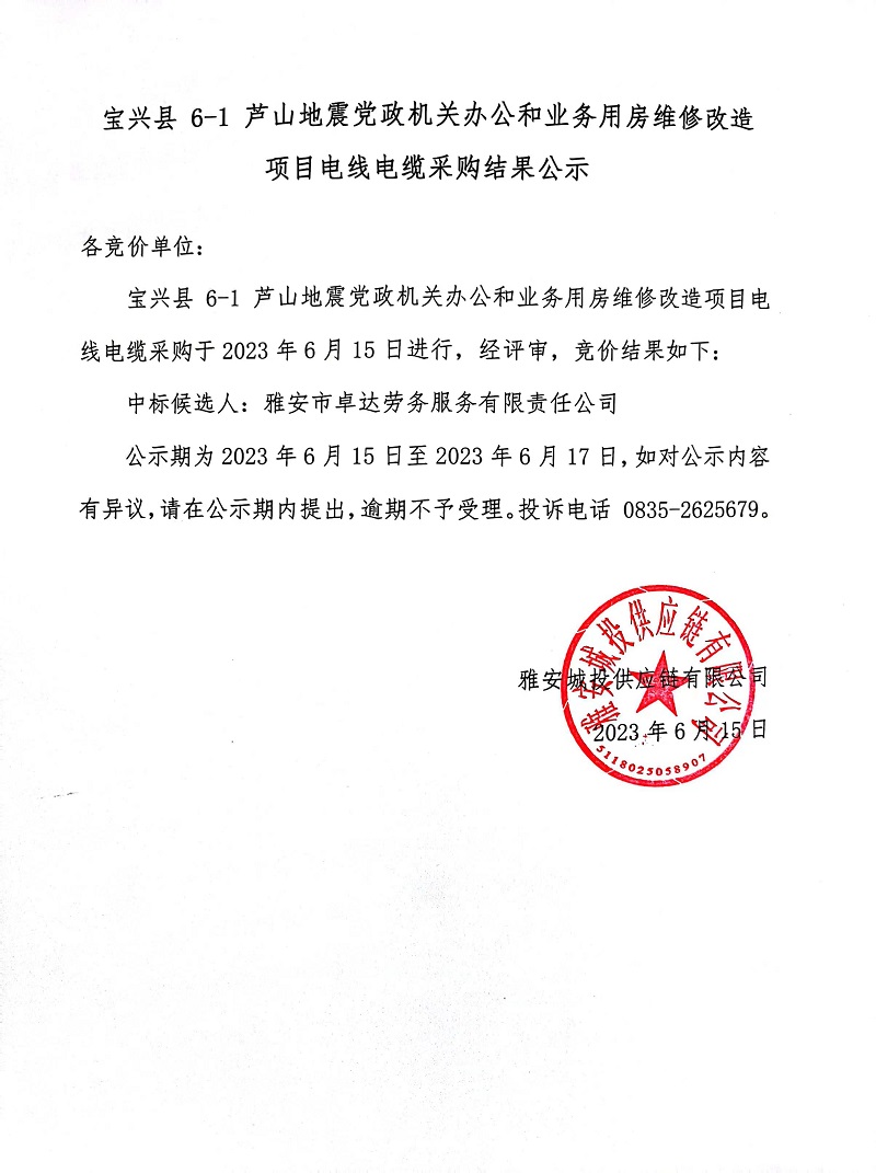 寶興縣 6-1 蘆山地震黨政機關辦公和業(yè)務用房維修改造項目電線電纜采購結果公示