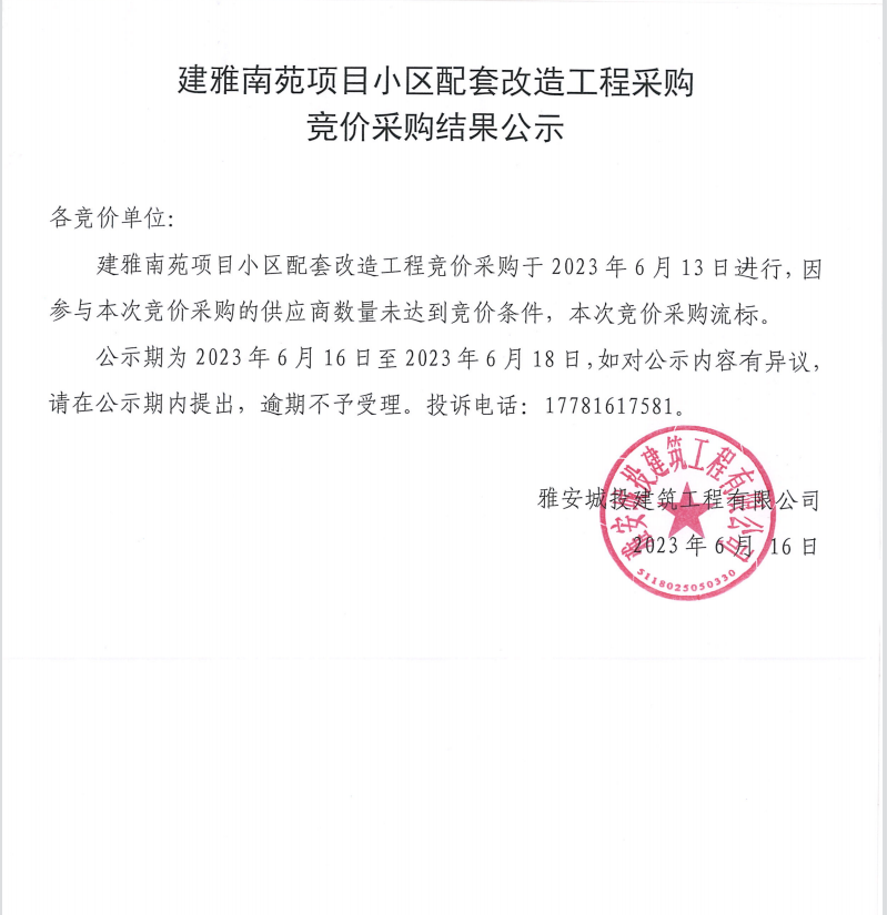 建雅南苑項(xiàng)目小區(qū)配套改造工程采購競價(jià)采購結(jié)果公示