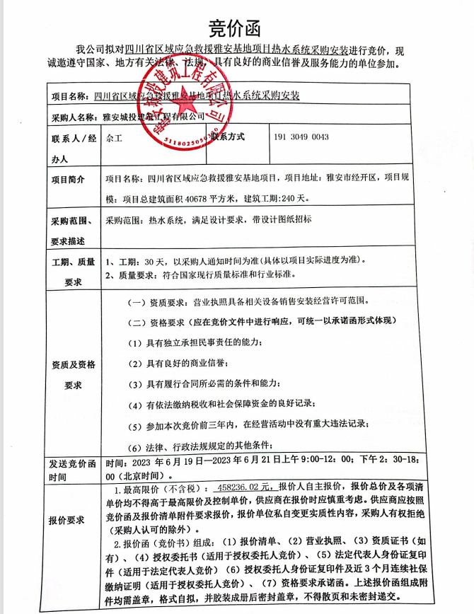 四川省區(qū)域應(yīng)急救援雅安基地項目熱水系統(tǒng)采購安裝競價公告