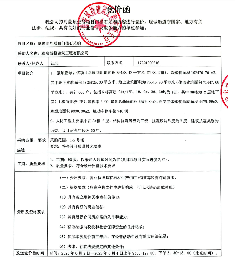 蒙頂壹號(hào)項(xiàng)目門檻石采購(gòu)競(jìng)價(jià)公告