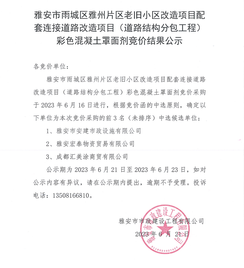 雅安市雨城區(qū)雅州片區(qū)老舊小區(qū)改造項目配套連接道路改造項目(道路結構專業(yè)分包工程)彩色混凝土罩面劑競價結果公示