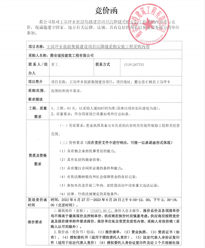 王崗坪鄉(xiāng)旅游集鎮(zhèn)建設項目沉降縫采購安裝工程采購內容競價公告