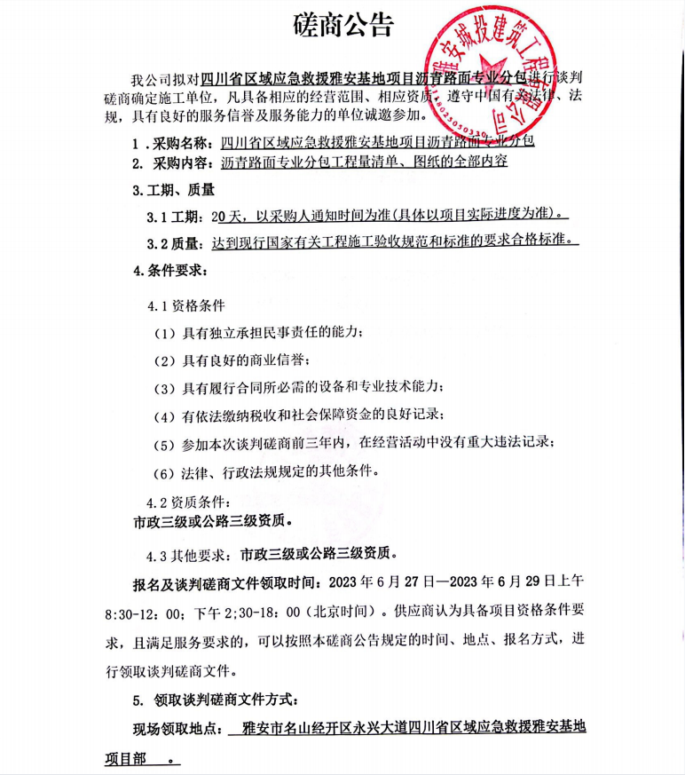 四川省區(qū)域應(yīng)急救援雅安基地項(xiàng)目瀝青路面專(zhuān)業(yè)分包談判磋商公告