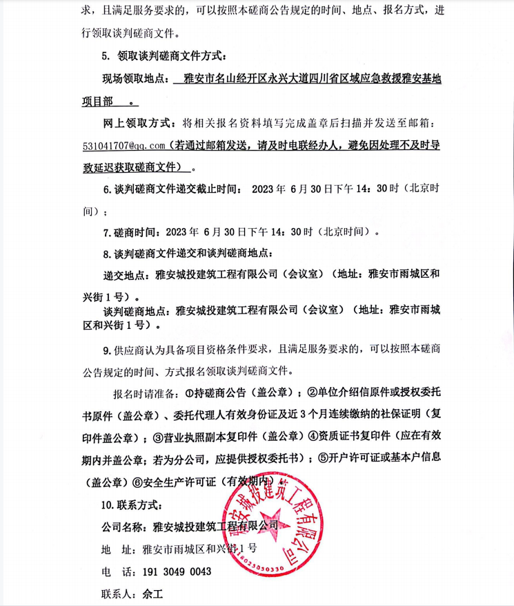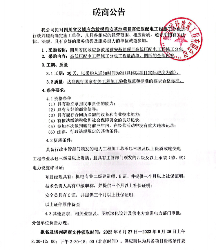 四川省區(qū)域應急救援雅安基地項目高低壓配電工程施工分包談判磋商公告